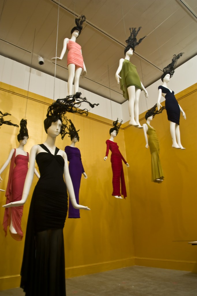 In reference to the above images, Unravel: Knitwear in Fashion exhibited a wide variety of exquisite knitted garments and accessories from across the last centuries. There was a mix of pieces by national and international designers and labels, historic couture pieces, as well as more avant-garde and cutting edge pieces by established designers and newcomers on the international fashion scene. This show was an example of combining an historical perspective with up and coming designers.
