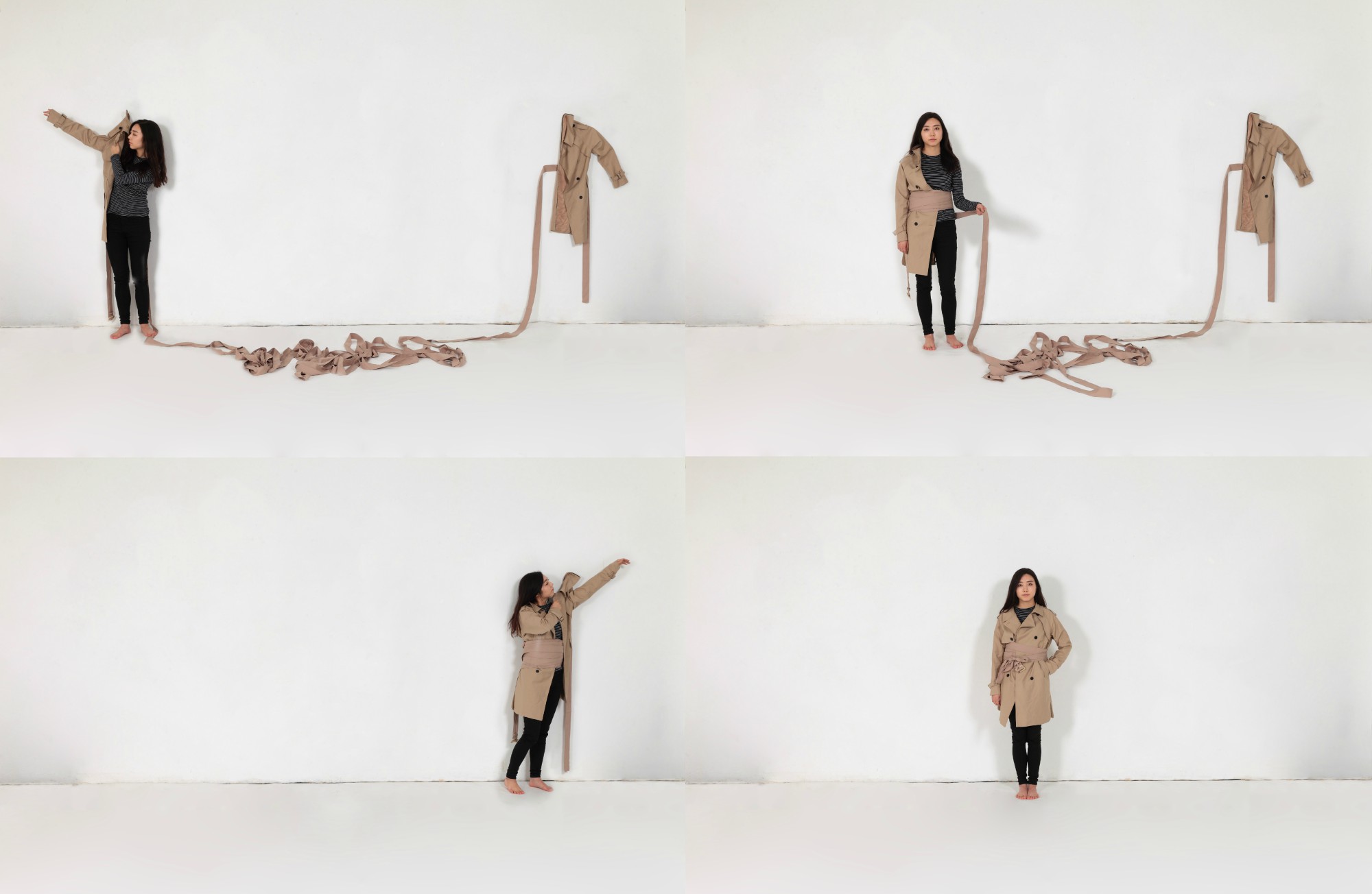 I want to give the present to those who are willingly sacrificing their present for their future. In order to experience the present behavior when wearing clothes, I slightly modified the shape of the clothes and the process of wearing it. It takes more time to wear these clothes, and requires new sets of movements. Crawling through a dark aisle, spinning in circles, raising, etc. are movements that break the repetition of routines that makes wearing clothes lose its original purpose, thus becoming a present act.