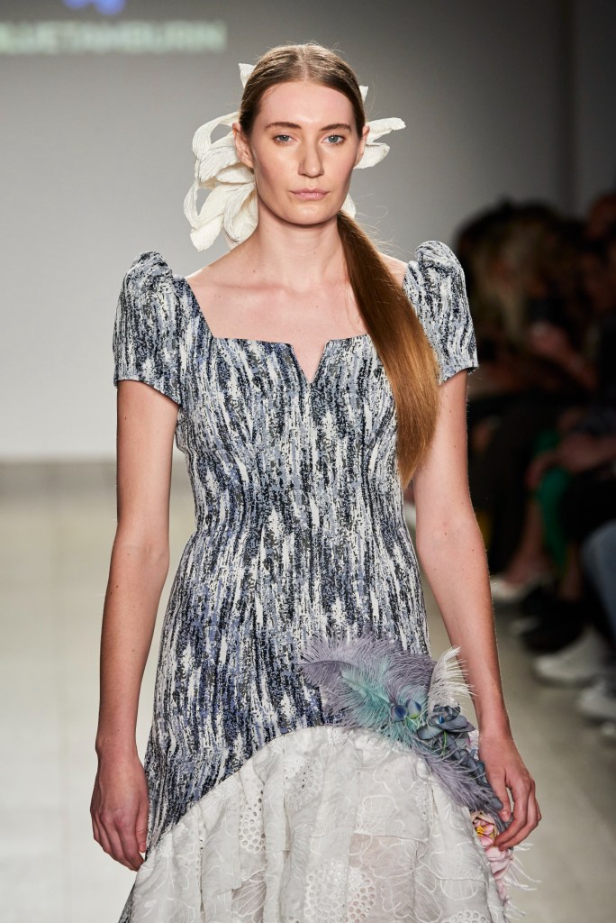 Collections are usually designed to relate by materials, color, and lines, however in the Touch collection, each look is solo in representing, as Kim describes, different personas. But I must say, the collection compels you to want to ‘touch’ the extraordinary fabric used. Each ensemble features texture through draping, layering, shine, lace, ornamentation, pleating, tucking, printing, asymmetrical lines – a mesmerizing courage of conviction.