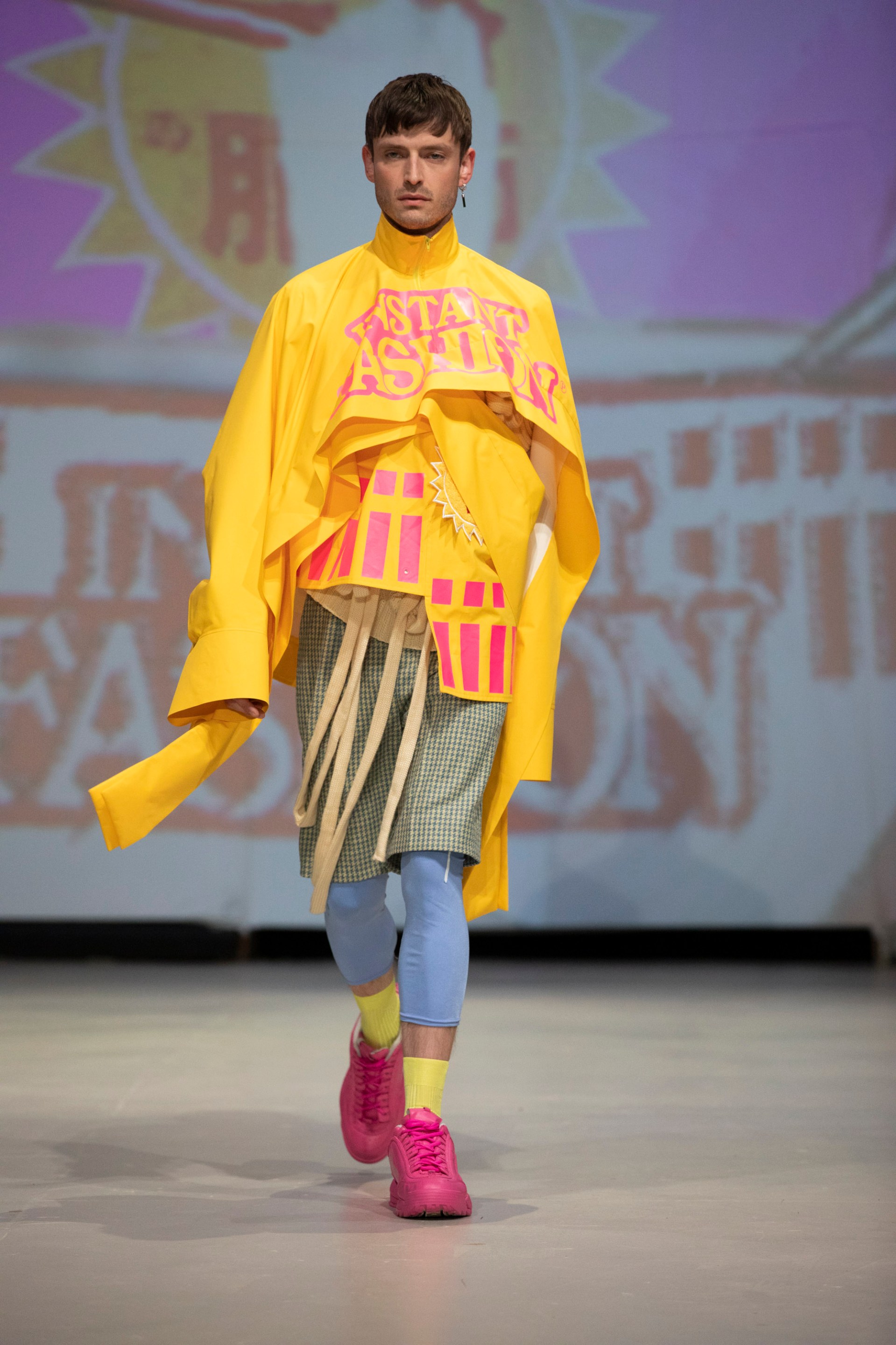 “Instant Fashion” makes use of style elements from streetwear. The ensembles are a mix of oversized and body-hugging proportions, in bold colors, contrasting with the classic men’s suiting fabric, Prince of Wales check. Kaul describes this body of work as “an avant-garde examination of instant noodles”. “The idea was to create a quote about the archetypal instant noodle packaging that was as accurate as possible, yet abstract, so that the viewer is immediately reminded of the model, in the hope that he understands the criticism that lies in the name instant fashion.”