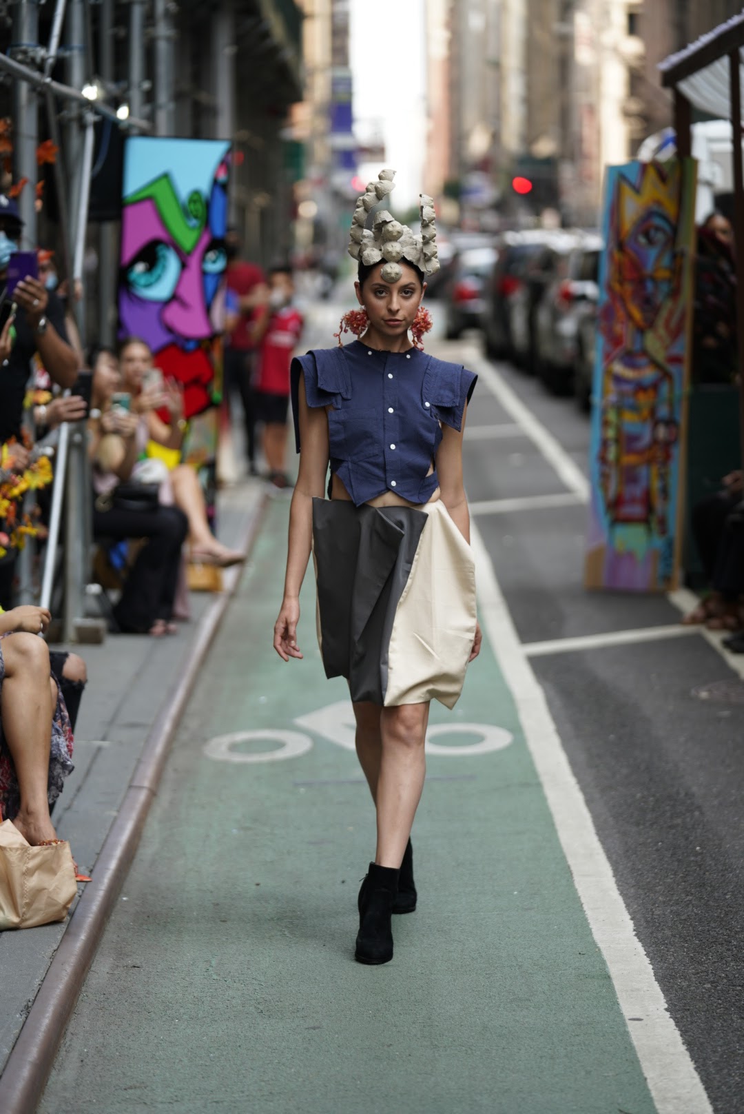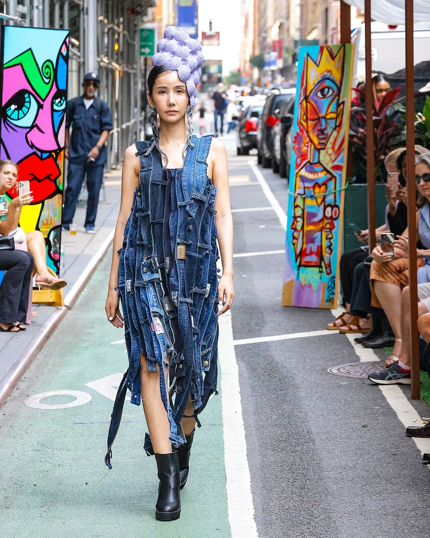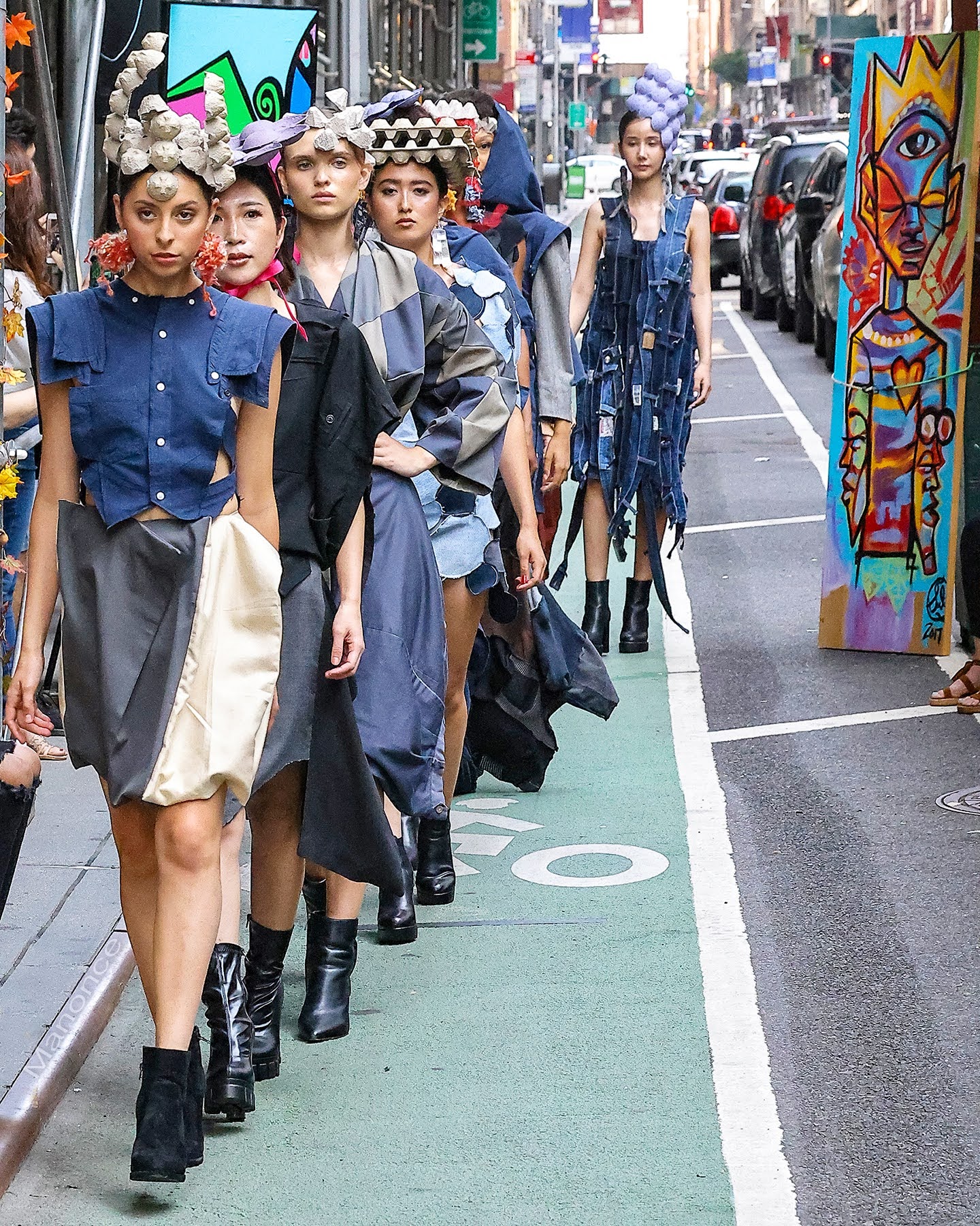 Kojima’s upcycling talents go beyond remaking garments from waste. Presenting at New York Fashion Week Sustainable Fashion show, I saw that she was an emerging designer that offered “the unexpected”. The show was a street runway affair and as the models strutted down the sidewalk I was not only captivated by her designs, but the headwear, too. She channeled extraordinary creativity in a reimagined everyday food container, the egg carton, as headwear. Each piece was sculpted differently.