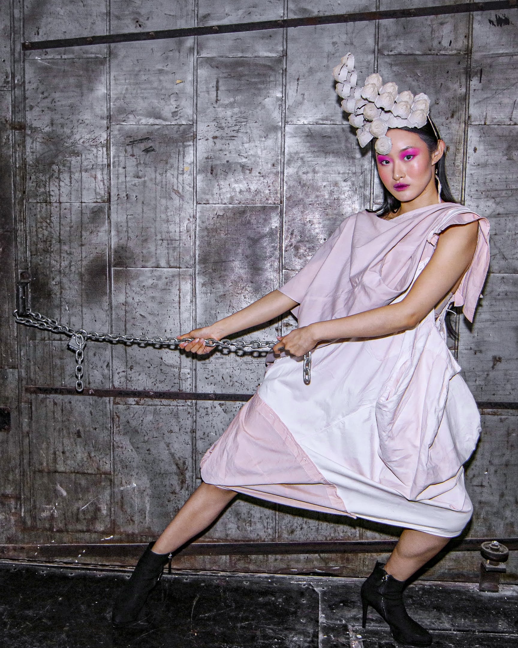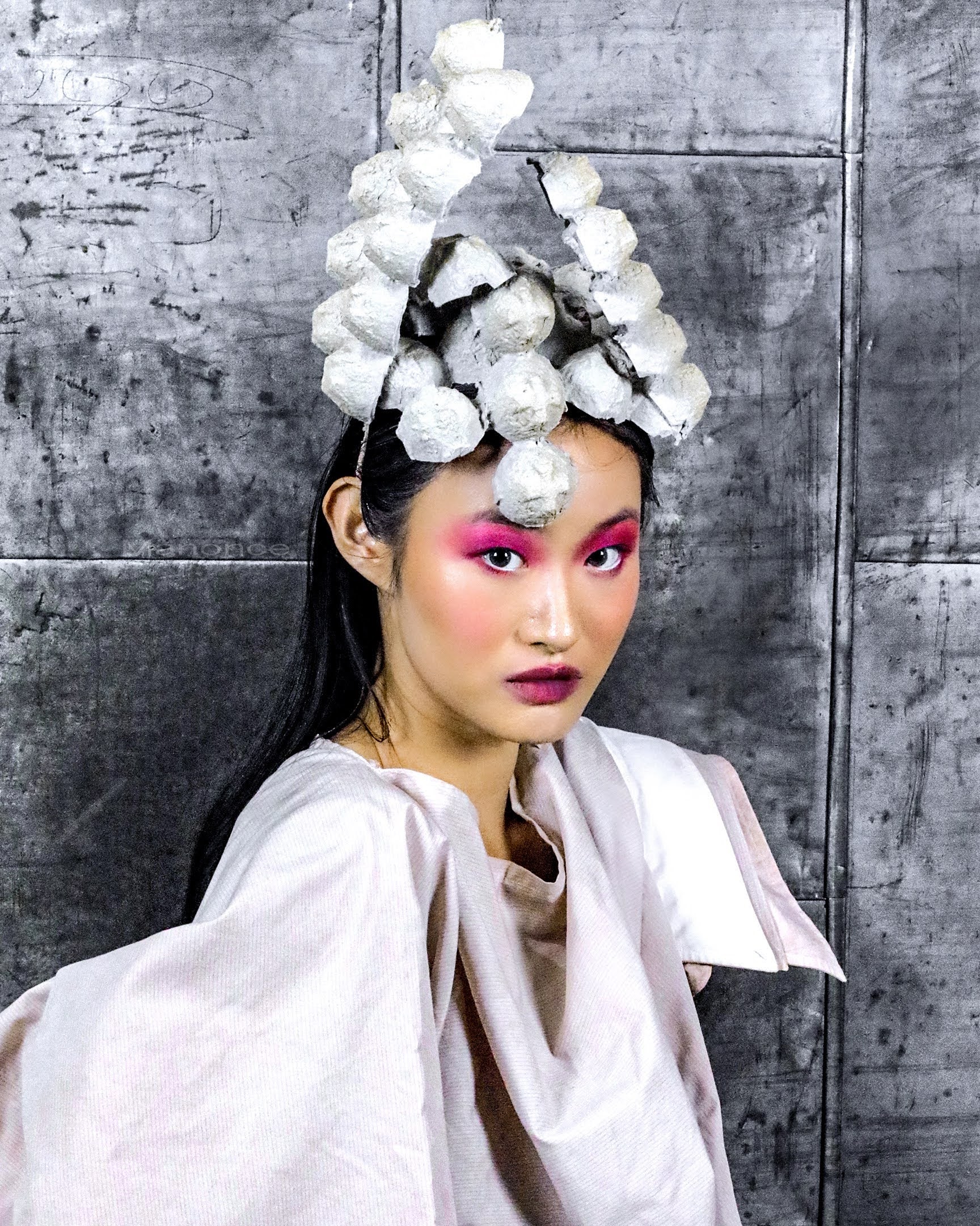 In our interview, I was so enamored by the collection, whimsical came to my mind and she said, “thank you, whimsical is a good word to explain”, as she went on to explain the story behind it. An experimental project to find a way to make a multifunctional garment out of paper or paper mâché eventually led to the Egg Carton headwear collection. After exhausting her efforts to find a practical application and execution for the “paper garment” project, she abandoned it to look for other options. “I started to look into other paper options and I found lots of egg cartons piled up on the streets. Hmm, I like the shape. What can I make with these? First, I made bags with egg cartons and people liked them. But it wasn’t realistic for daily use as paper gets very weak with water. Hmm, how about more decorative items … Then I came up with making cocktail hats with paper material. Here we have different styles of egg carton headwear! Once I can figure out how to enhance the strength of the egg cartons, I think it could be quite possible that people will walk around with an egg carton bag and headwear.”