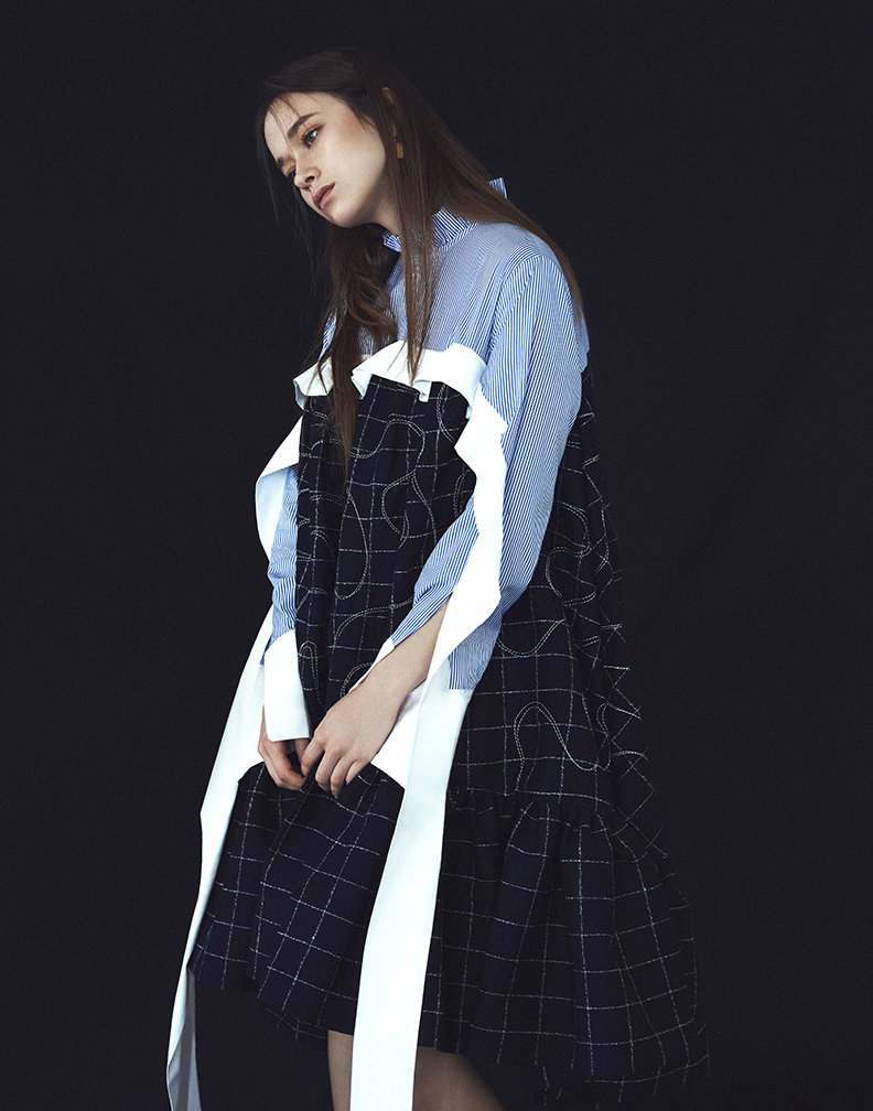 Yes, that’s right, Look 3 of Ruree Lee’s collection, Presence/Absence, can be worn with your hands tied to the front (or better, the back?). Lee is sending a message about phone culture and our addiction to the screen. She says, “I wanted to make a fun message. Since the dress represents ‘touching phones’; the square print represents the screen and the organic embroidered shape represents the fingerprints. I wanted to tie the hands so that you couldn’t use your phone! So, I would say, this knot symbolizes a restriction of phone usage.”