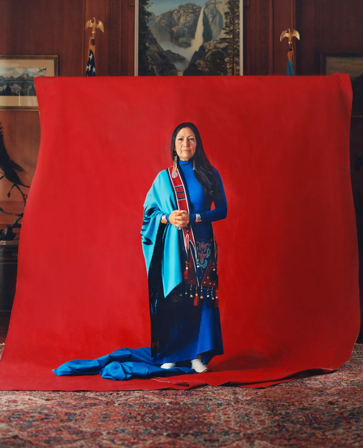 America is known for its ‘firsts’. We started with von Furstenberg’s ‘fashion is by definition a reflection of what is going on in the world’. What we know is that change is a constant and with change comes ‘firsts’. “It’s important for my work to affect change,” Emmerich told moderator Regan de Loggans, (Mississippi Choctaw), curator, The Museum at FIT, in conversation with Jeffrey Gibson (Choctaw Cherokee). America celebrated a long overdue socio-political change, a ‘first’, when Deb Haaland became the first Indigenous United States cabinet member (2021), Secretary of the Interior. Fashion has the power to transform culture and we bear witness to its contribution to culture. Secretary of the Interior, Deb Haaland wore Emmerich’s Snoqualmie dress, on view in ‘CLOTH’, and was featured on the cover of InStyle magazine’s August 2021 issue, giving InStyle the 2021 Adweek’s Magazine Cover of the Year.