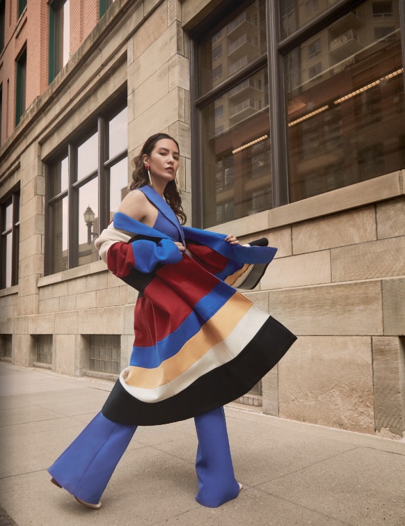 The Cape Coat ensemble, which was featured on the cover of Native Max Magazine’s July/August 2022 issue, worn by Indigenous Canadian Film, TV actress Jessica Matten, is part of the Misshapen Chaos of Well Seeming Forms collection. Knowing the meaning and story behind this look channels an appreciation and value that is mostly missed at point of purchase. Wanting to reinstate value in clothing, Emmerich operates solely within a circular fashion system and uses wool as a staple cloth throughout her brand. The ensemble is made from Pendleton® wool, offering renewable value. The look, inspired by the utility of Pendleton® blankets, preserves Emmerich’s heritage, while adopting a modern aesthetic, as she details, “The Cape Coat is inspired by blanket coats and traditional wool capes, bringing a contemporary twist to a traditional classic.”