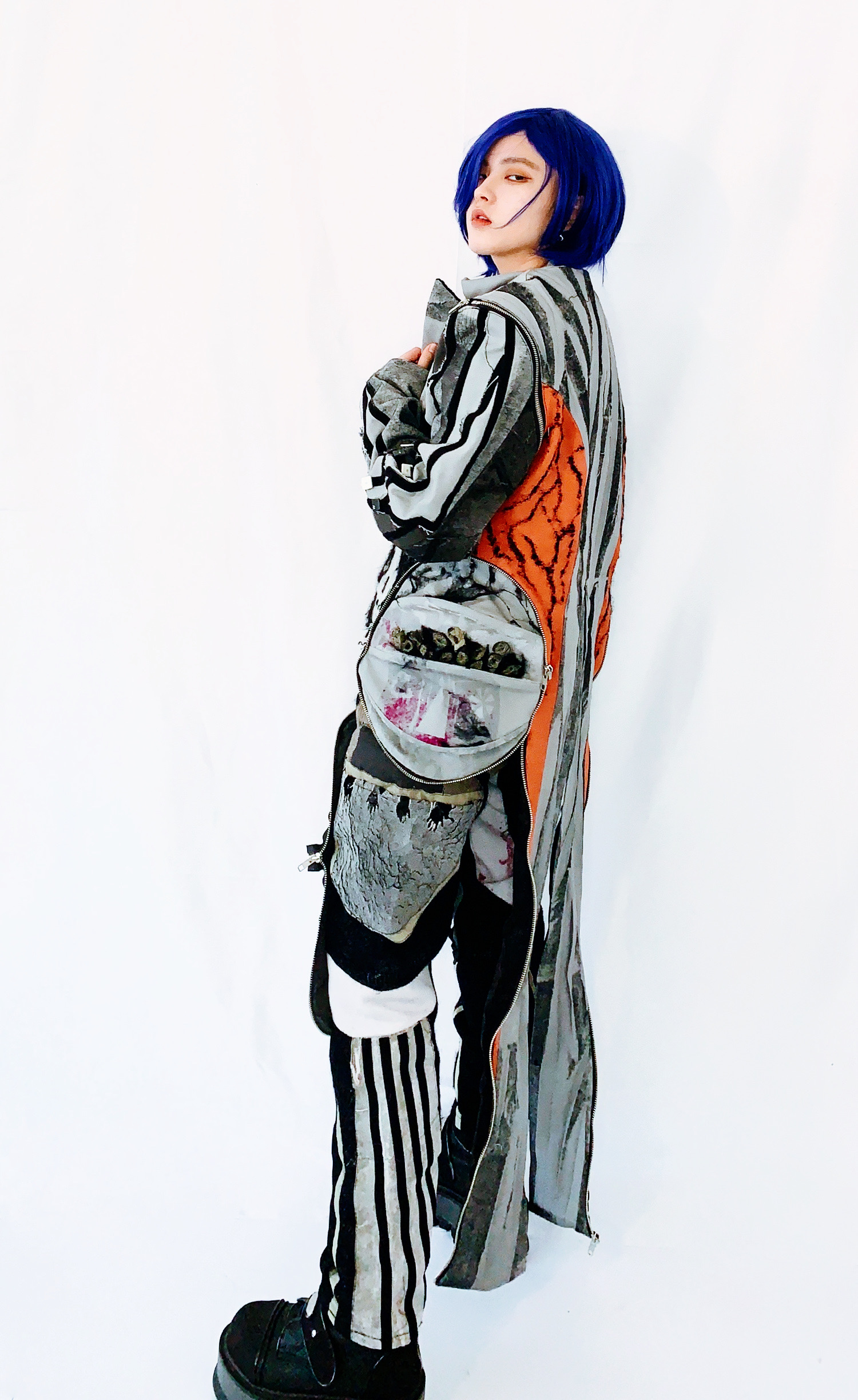 JC. I aimed to infuse my visual designs with imaginative imagery, drawing inspiration from unexpected sources. For instance, I integrated the structural elements of baby stroller caps—symbolic of birth—into garment hoods, merging functionality with aesthetics. Additionally, motifs like skulls and spooky elements in my textile designs resonate with themes of mortality and the consequences of unsustainable living. With a personal aesthetic leaning towards retro-futurism and a warrior aesthetic, I explored intricate garment details, prioritizing both functionality and visual impact. Introducing detachable features not only enhances garment versatility but also addresses the issue of overconsumption and the tendency for similar styles to be purchased multiple times. Reflecting on my upbringing near packaging factories, where excess packaging contributes to environmental degradation, I reimagined fashion packaging. By integrating ‘packaging patterns’ into garments through real packaging design techniques, I aimed to create clothing that could self-package, minimizing waste and promoting easy storage. This approach resonates deeply with my vision of my own neighborhood filled with clean air.