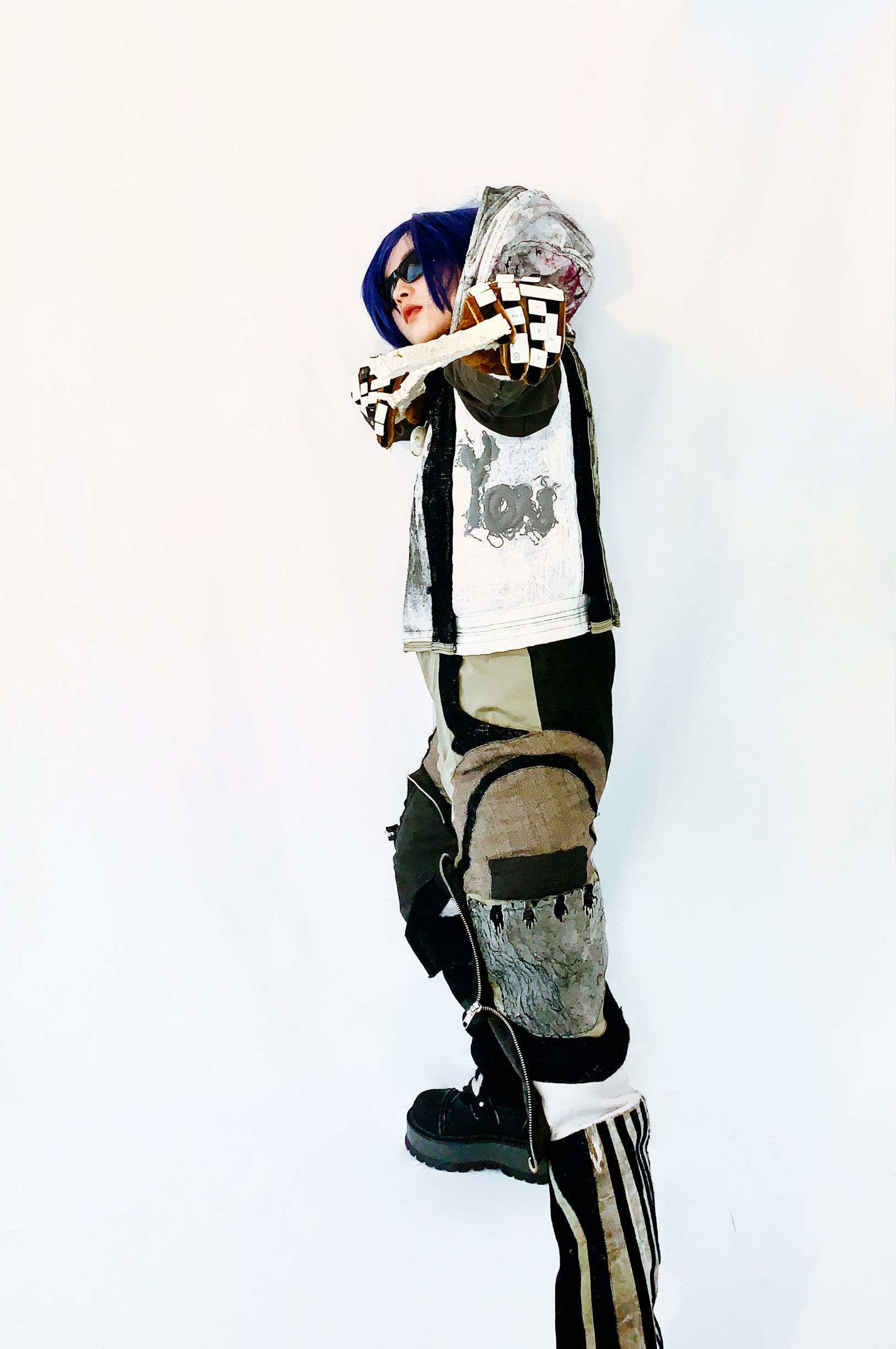 JC. Yes, in addition to collecting ‘trash,’ I ventured into experimenting with biomaterials, particularly mycelium. Harnessing the natural growth capabilities of mycelium, I cultivated it within a mold to create the skull pendant, which I then used as the zipper pull and the swords in my photoshoot.