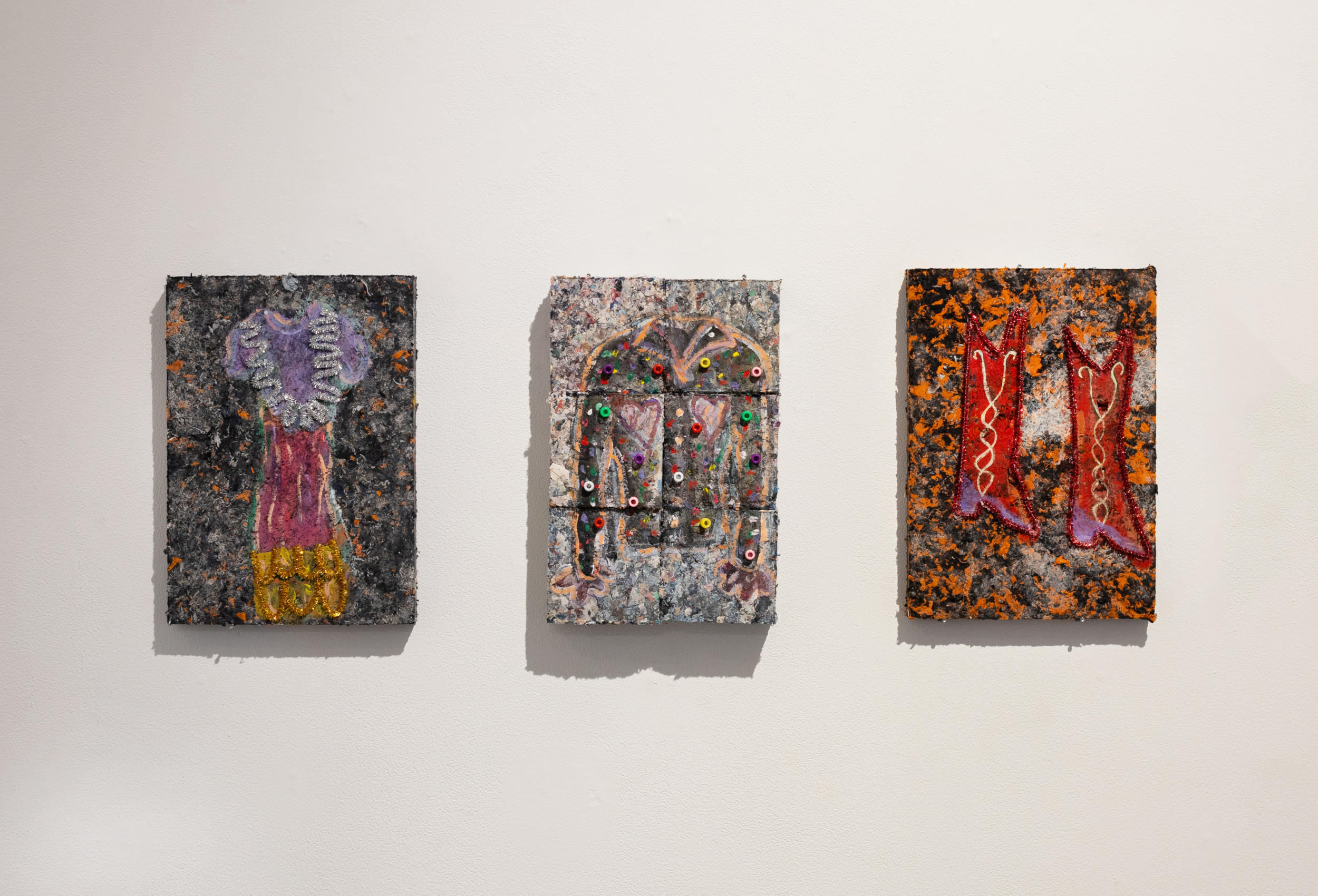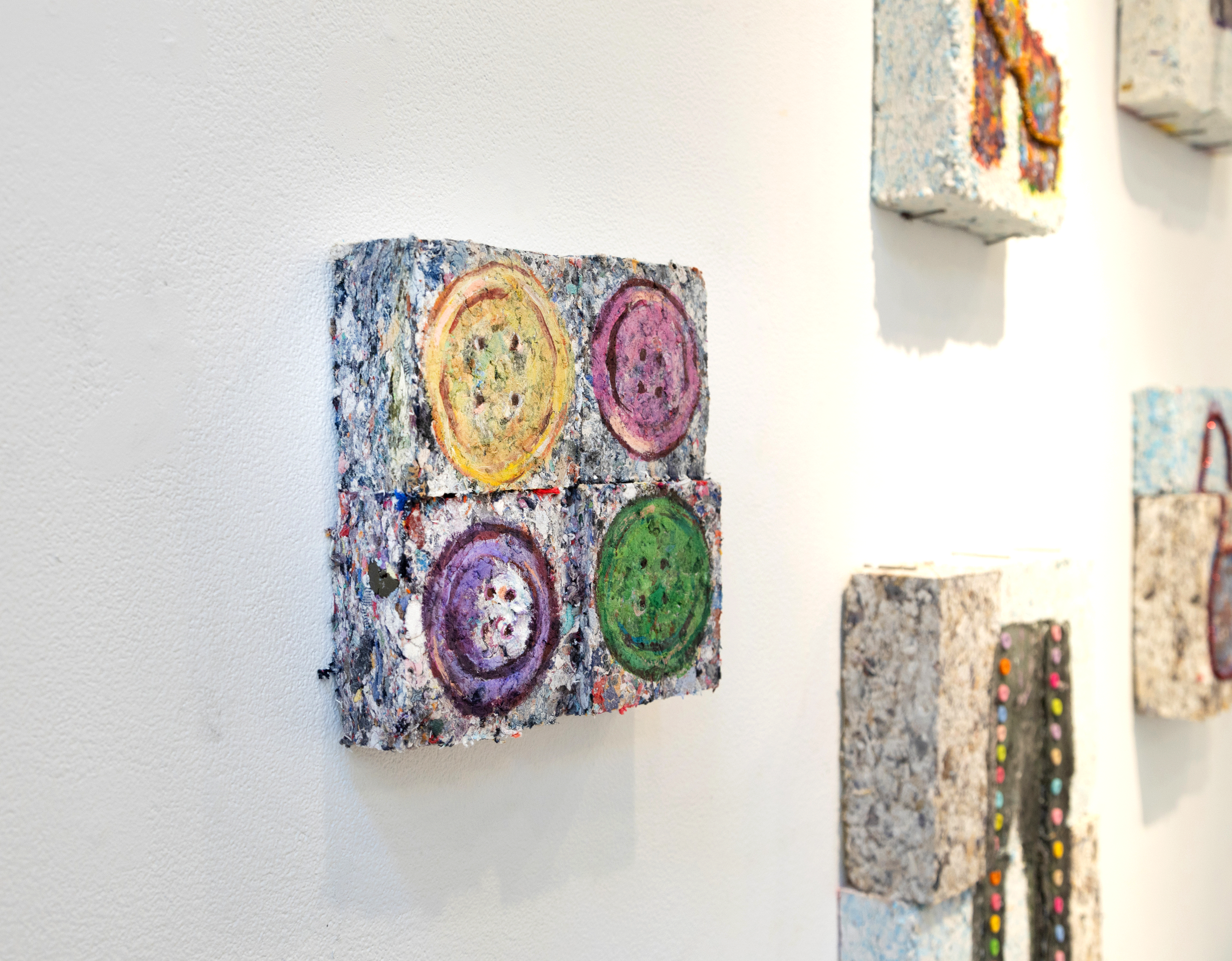 RP Hill: Tell me more about the mixed media art on fabric bricks, made from the French company, FabBRICK, that recycles discarded textiles through a reprocessing method. Why and how did you discover them?