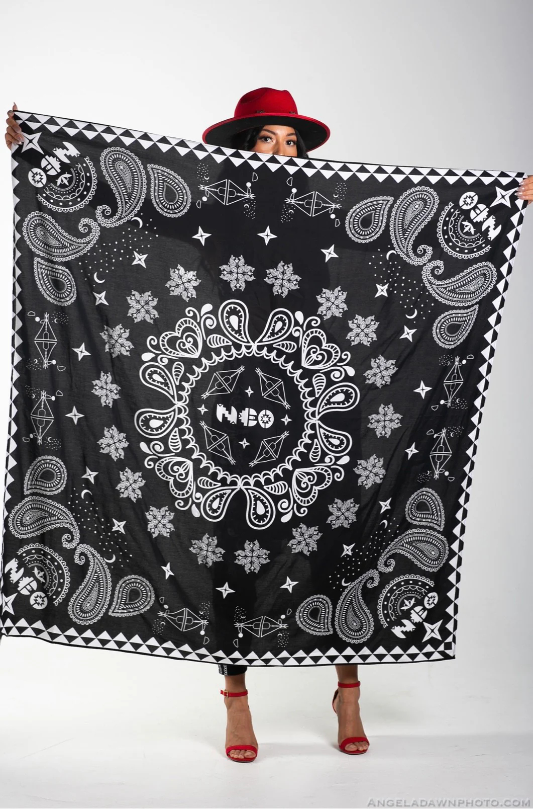 For instance, Elements is designed to raise awareness of the significance and respect for the natural elements—air, water, earth, and fire—in maintaining a balanced and sustainable relationship with the environment, a principle deeply rooted in her indigenous heritage. Symbolic Indigenous icons, like “tipis under the moon and stars,” are prominently featured in the black and white paisley Starry Skies pattern, with statements such as “The floral mandala designs represent the spiritual significance of the interconnectedness of all living beings and cycles of nature” that underscore their environmental principles.