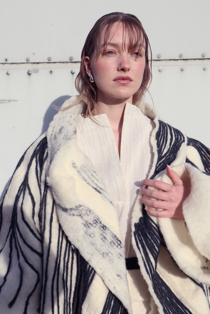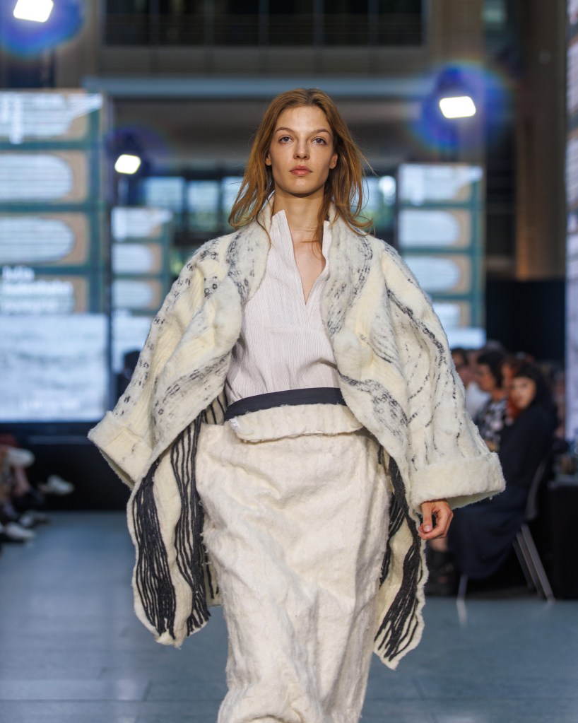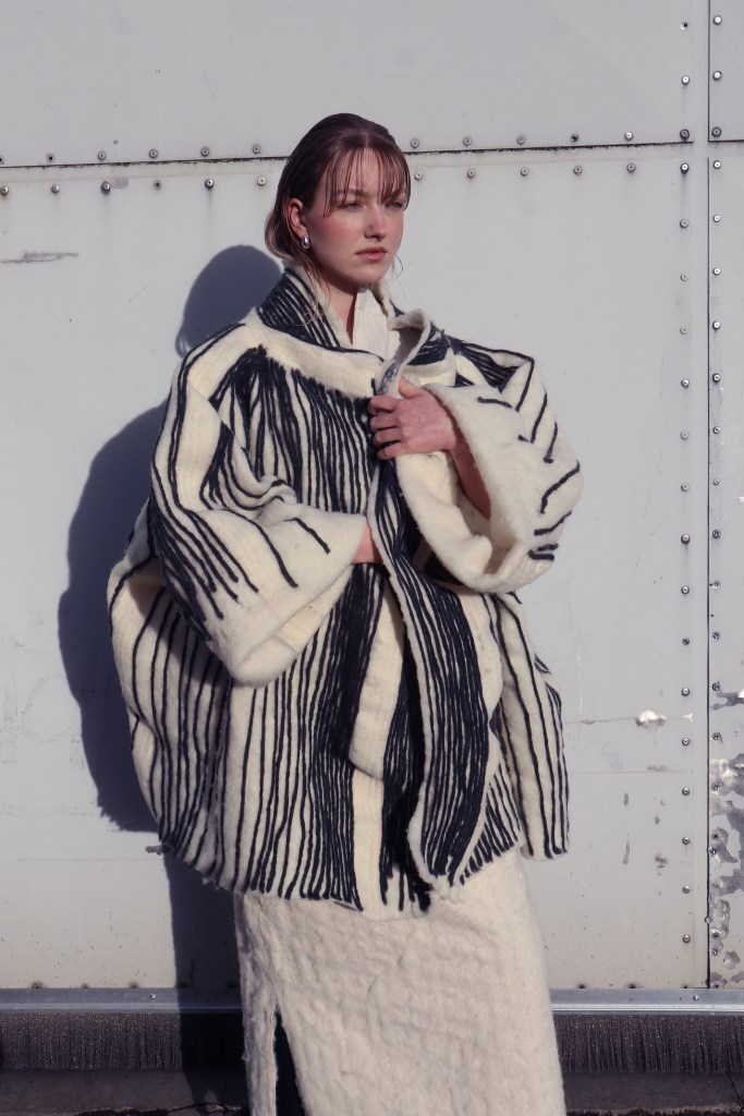 I see similarities between the exhibition and contemporary designers like Julia Judenhahn, who is based in St. Gallen, Switzerland. She holds a Bachelor of Arts degree in Fashion, from the School of Design Pforzheim, in Pforzheim, Germany, and further honed her skills through studies at HEAD Genève, Fashion Design, and Politecnico di Milano, Fashion Design. Through the use of traditional methods paired with experimental techniques, she delves deeply into the exploration of new textile textures, pushing fashion beyond traditional limits, from raw fiber to the finished garment. Her work combines sustainability, minimalism, craftsmanship, and innovative materials, creating a new story in fashion that values both art and environmental responsibility.