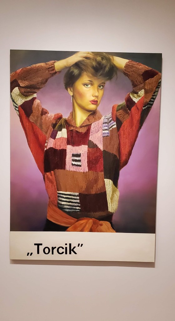 Torcik is based on one of a group of vintage postcards Olowska found that depict chic models wearing hand-knitted sweaters with geometric patterns. During Poland’s Communist era (1945-1989), the state deemed modernist abstraction ideologically unacceptable. Circulating underground, these cards may have prompted Polish craftswomen to knit their own variants of the samizdat (forbidden) designs in defiance of the drab state-sanctioned dress codes of the time.