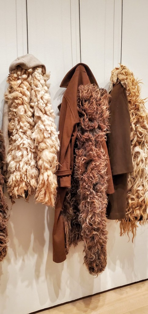 Hamilton conceived this visceral work both for a performance and an installation in Guimarães, a former textile manufacturing hub in northern Portugal. First, she sourced men’s and women’s coats from from thrift shops and fleeces from a local farmer who bred heritage sheep (regionally specific historical breeds) as part of a sustainability initiative. Then she needle-felted the raw, unwashed fleeces … (side by side.coats) calls out enduring interdependencies between human and animal, manufactured and organic …