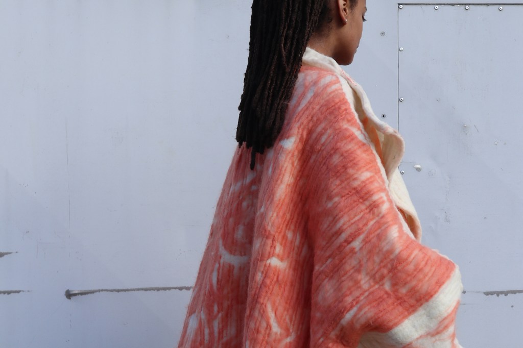 In light of the criticisms faced by the fashion industry regarding its wasteful practices, Judenhahn presents the body of work puregrid as a viable solution, using wool fleece (Lavalan Pure) from Lavalan—a renewable resource—as the base fabric. In contrast to the conventional path of mass production, as evidenced in Ann Hamilton’s process, Judenhahn utilizes needle-felting, a technique that transforms wool fibers into a finished garment with minimal environmental impact. This sustainable approach not only signifies a strong commitment to the environment but also embodies a compelling creative challenge. The limitations of these materials inspire Judenhahn, empowering her to experiment and innovate in ways that most designers wouldn’t consider.