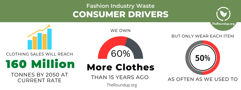 According to Roundup.org, data sourced from UNEP, Global Fashion Agenda, Science Advances, and the Ellen MacArthur Foundation, between 80 and 100 billion new clothing garments are produced globally annually. 87% of the materials and fibers used to make clothing will end up in either incinerators or landfills. 92 million tons of textile waste are generated each year, of which China (20M tons) and the US (17M tons) produce the most. Only 20% of discarded textiles are collected, and only 1% of clothes will get recycled into new garments.